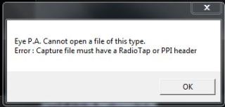 One of the limitations of EyePA is that it only supports a direct WLAN Packet capture through AirPCap or through another type of raw wireless packet capture. Specifically, it needs to have the radiotap headers or the regular 802.11 headers.
