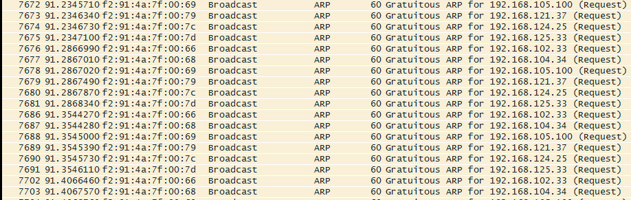 You can see it does a lot of GARP for addresses on the VLANs I am monitoring. I also observed it sending DHCP requests on the VLANs configured as well: