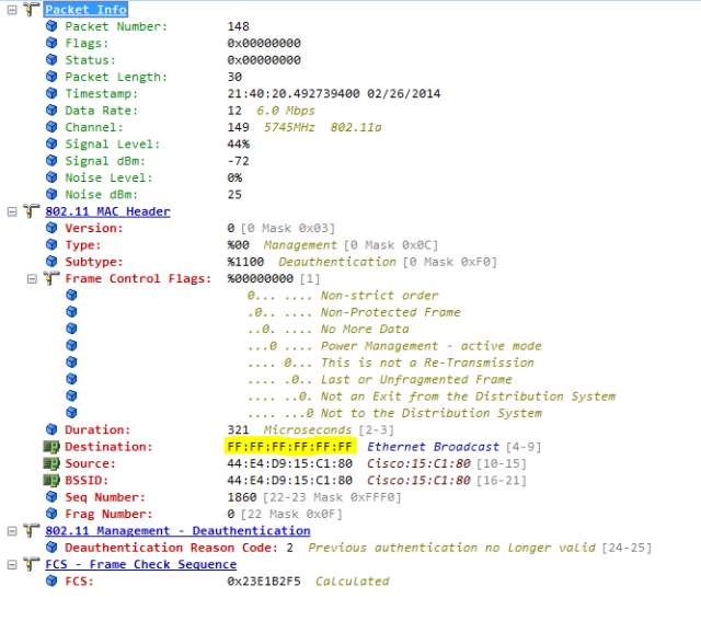 So the Airtight AP sent a broadcast de-authentication packet spoofed from the rogue SSID. This is fine since A. this rogue is on my network and B. I’ve decided to quarantine it. I was half expecting to see a unicast deauth, but broadcast works fine in this scenario.