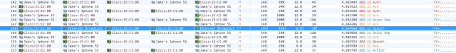 Here you can see a pretty textbook capture of the authentication/association process of “Jake’s iPhone 5S” to my survey-5 SSID (open).