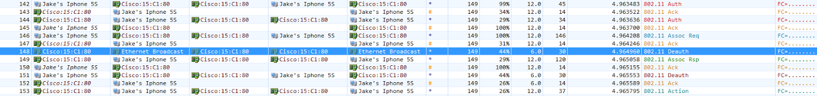 Now let’s look at the deauthentication that occurs right after the association response. This time it appears that the deauth is coming from my iPhone. Notice again that it is sent at 6Mbps.
