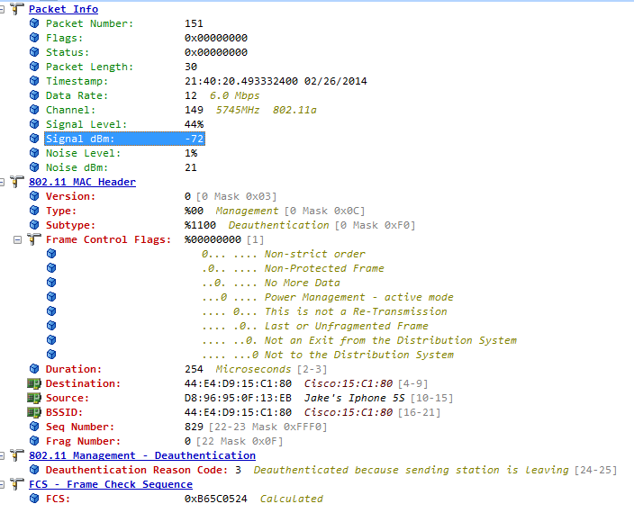 We can see that the Airtight is now pretending to be my iPhone, saying that my iPhone has decided to leave the rogue SSID. I honestly didn’t expect this, but it totally makes sense. In addition to make sure the client has left, it makes sense we should also send AP a deauth so it ends the clients session, ensuring the client is dropped if it doesn’t listen to the deauth message. Comparing the signal strength to my client