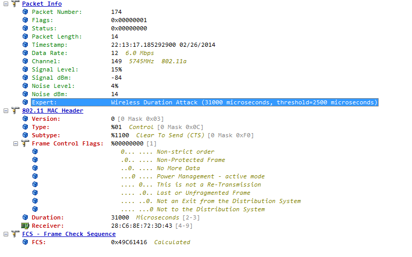 Shortly after connecting, we see omnipeek detect a wireless duration attack, which just appears to be a CTS to self with a very large duration field: