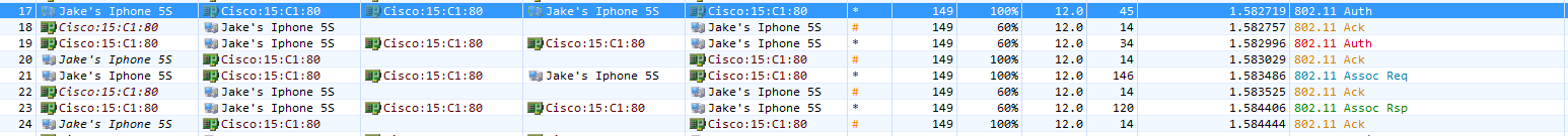 Here you can see a pretty textbook capture of the authentication/association process of “Jake’s iPhone 5S” to my survey-5 SSID (open).