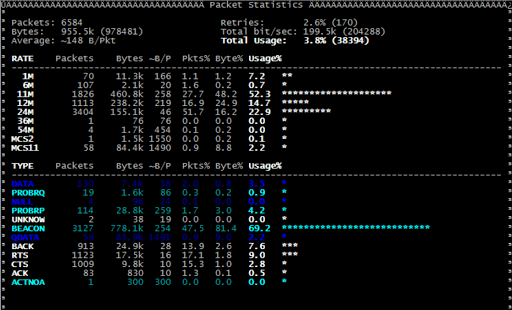 a – Brings up the stats window. This is useful for determining things like retry rates, packet type, data rate percetages, etc.