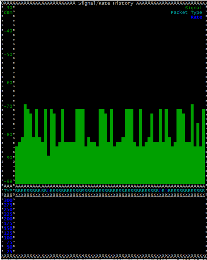 h – Displays the signal/rate history – the top window displays the signal level of all the packets received. The bottom window shows the data rate of those packets.