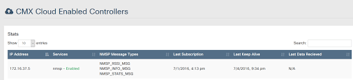 Once you have the site created and the AP added to the site, I verified that I saw the Mobility Express controller connected to CMX and that I started to receive data.