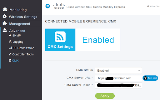 Now for the CMX Cloud component. I signed up for a CMX Cloud trial at cmxcisco.com. It warns you that it can take up to a day to receive your account info. Less than an hour later, I had my login credentials, server url and authentication token. Going to the Mobility Express GUI, I was able to configure this with a minimal effort.