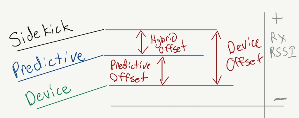 Once the predictive design is complete, it shows that the signal level at the far wall of a large room should have a signal level of -65 dBm. Now we install the AP and take our iPhone to the same location and measure with a result of -70 dBm. This result shows that our Predictive Offset should be -5 dBm. If we were to survey this with the Sidekick, let’s say it showed a value in the same location of -62 dBm. These measurements result in a Device Offset of -8 dBm and a Hybrid Offset of -3 dBm.