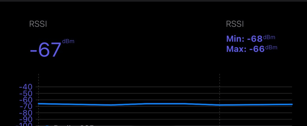 In this example, I would start with my iPhone 15 and walk away from the AP while performing scanning. I currently use nOversight on iOS to measure this. I walk away until I hit my desired threshold (-67dBm). Once the threshold is reached, I’ll restart nOversight and hold the phone stationary to confirm that the min and max values are relatively consistent. In this case, it’s + or – 1 from -67dBm.